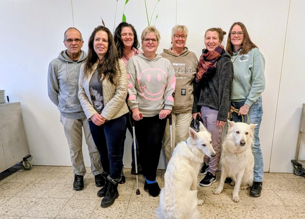Das Gruppenfoto zeigt den frisch gewählten Vorstand – begleitet von zwei treuen Vierbeinern, die sinnbildlich für die enge Verbindung von Mensch und Hund im Verein stehen.